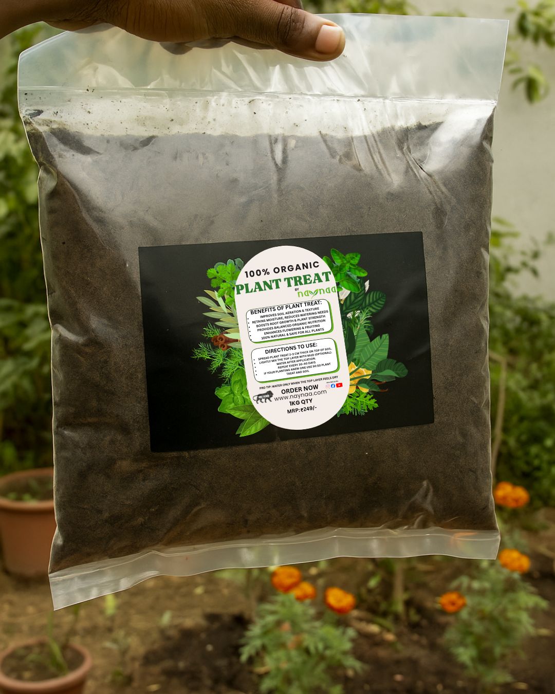 Naynaa’s 100% Organic Plant Treat is a natural soil enhancer that improves aeration, retains moisture, and boosts root growth. It strengthens plants, enhances flowering and fruiting, and provides balanced organic nutrition — safe for all plants. Simply spread 2–3 cm on top of the soil, mix lightly, and water. Repeat every 30–40 days for best results. Perfect for gardening lovers seeking healthy, thriving plants. Available in 1KG pack at ₹249